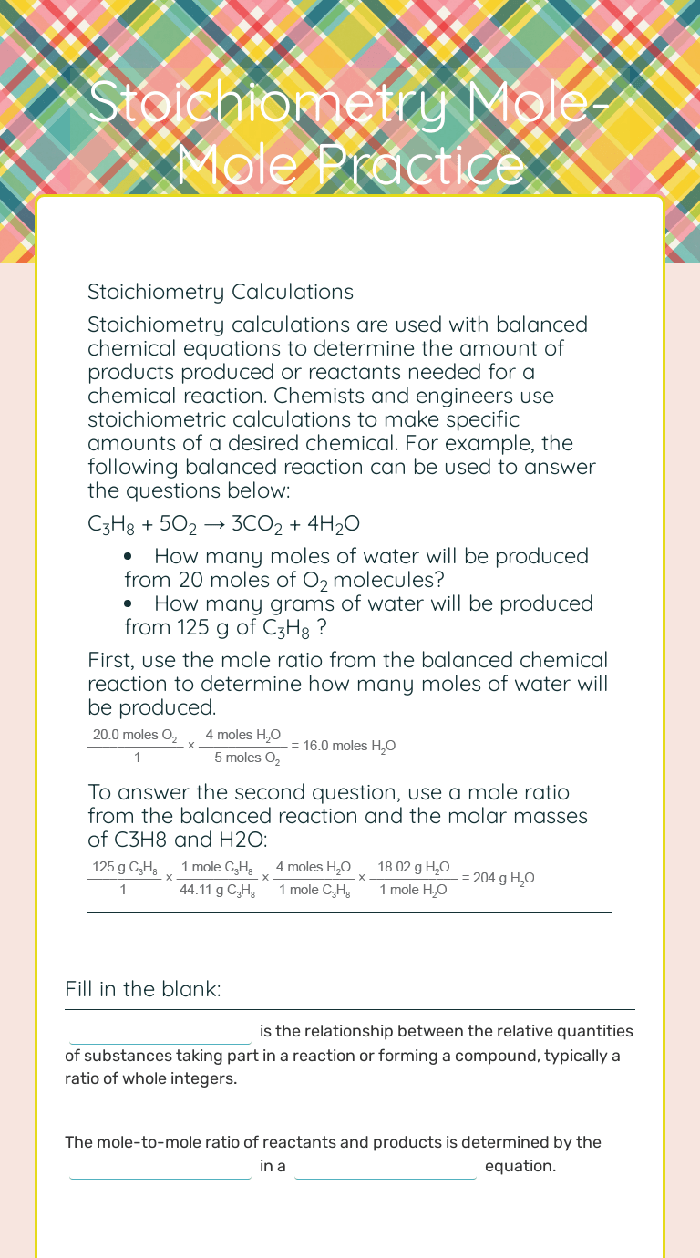 Chm 130 stoichiometry worksheet key. Product are an editable word document, a pdf, and an answer key. Answer the questions about the following chemical reaction::. You will receive your score and answers at the end. Identify the three steps in the three step method of calculating products described in the notes. Choose an answer and hit 'next'. Answers are provided on the second sheet. Substance to mass by using the molar mass. In addition, you have learned to write chemical equations so that they represent the rearrangements of atoms that . Using the calculated numbers of moles and the molar masses, convert the unknown quantities to the required units (usually grams). 3.9 g of potassium reacts . The worksheets at the end of this . Please try to do the worksheet without referring to them, because you'll be expected to know this stuff on the.